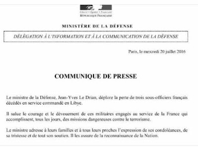 Dans la foulée, un communiqué du ministère de la Défense avait déploré la perte de «trois sous-officiers français décédés en service commandé en Libye», nos fils, confirmant ainsi la présence des forces françaises sur le territoire libyen.