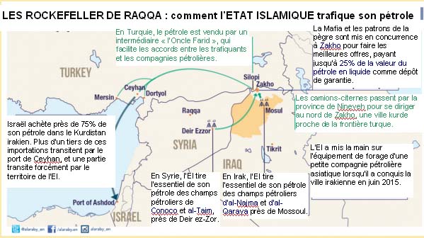 Le pétrole volé par Daesh (=EIIL=Etat Islamique) ne peut transiter à travers des territoires contrôlés par Damas. Il ne peut pas transiter par l’Irak sous domination chiite. Il ne peut pas passer à l’est vers l’Iran. C’est la Turquie ou rien. La Turquie est le bras armé le plus oriental de l’OTAN. Les Etats-Unis et l’OTAN «soutiennent» la Turquie. Donc on peut affirmer en fin de compte que les Etats-Unis et l’OTAN soutiennent Daesh. Ce qui est sûr c’est que le pétrole illégal de Daesh et le pétrole illégal du KRG (Gouvernement régional du Kurdistan) suivent le même modèle ; Des intérêts énergétiques par des suspects habituels jouant un jeu à long terme.