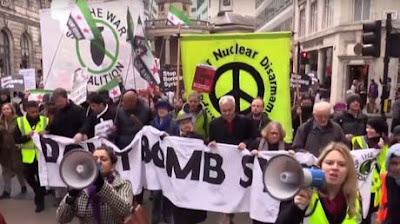 ++15/12 - A LONDRES, LES MANIFESTANTS POINTENT DU DOIGT L’INTERVENTION MILITAIRE EN SYRIE.